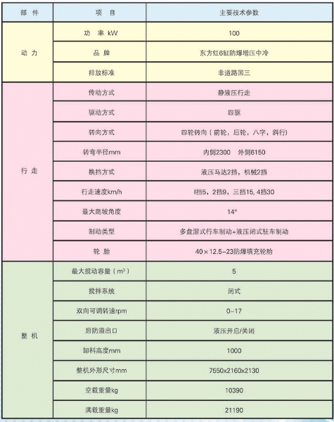 礦用防爆柴油機(jī)無軌膠輪車/混凝土攪拌運(yùn)輸車主要用于煤礦井下巷道中作業(yè),具機(jī)動(dòng)性強(qiáng)、體積小,車身窄、高度低等特點(diǎn),能同時(shí)完成攪拌和運(yùn)輸作業(yè)。該車以防爆柴油機(jī)為動(dòng)力,具有維護(hù)方便、性能等特點(diǎn)。該車采用靜液壓傳動(dòng)方式,傳動(dòng)效率高、油耗低、簡單可靠;該整車結(jié)構(gòu)新穎、性能優(yōu)良、運(yùn)輸效率高,是大中型煤礦及有瓦斯和粉塵爆炸危險(xiǎn)環(huán)境的混凝土攪拌輸送車產(chǎn)品之一。具體特點(diǎn)有:
