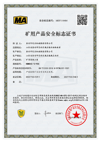 熱烈慶祝我廠礦用混凝土輸送泵通過煤安安全標(biāo)志證書(煤安編號(hào):MEF110483、MEF110484、MEF110485)。目前公司成功研制出HBMD15/6-22S混凝土輸送泵、以下簡(jiǎn)稱“15立方混凝土泵”,且在銷售市場(chǎng)俏銷的形勢(shì)下乘勝前進(jìn),又試機(jī)成功**款新型的高壓大輸送量混凝土輸送泵HBMD30/13-90S混凝土輸送泵、HBMD80/16-110S混凝土輸送泵,目前已成功申辦“煤安標(biāo)志”,把產(chǎn)品推向市場(chǎng)。